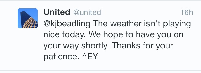 But just as all was nearly lost; when overnighting at a Holiday Inn Express and huffing on Greyhound exhaust fumes seemed the logical conclusion of our predicament; just as I started to warm — “it’s not that bad” — to the notion of flying from ORD to Cleveland in the morning, finally landing in Syracuse a full day later; the United social media marketing manager entrusted with the United Twitter keys came to my rescue. At precisely the same time as the United maintenance workers pulled a miraculous fix on the, gulp, “de-icing” equipment.
